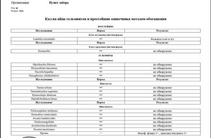 - Вариант 1 (отрицательный): «Яйца гельминтов не обнаружены».